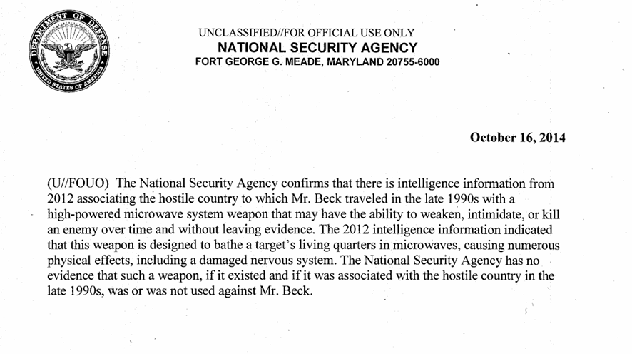 In 2014, in an unclassified memo marked “For Official Use Only,” the National Security Agency noted that the country visited by Beck possessed a microwave-based weapon capable of damaging the nervous system without leaving evidence: [source]